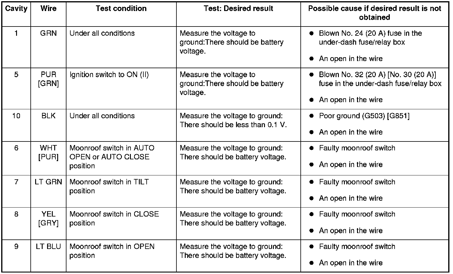 NOTE: If the moonroof works OK manually, but will not work in AUTO, or reverses frequently (obstacle detection), do the moonroof calibration Programming and Relearning before proceeding with the input test.