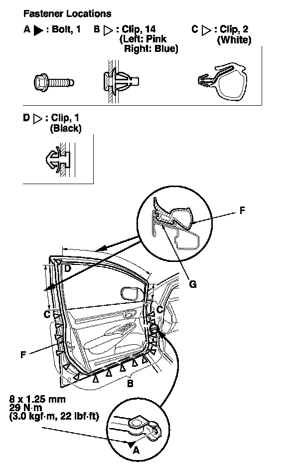 2. Detach the clips (B, C, D, E), then remove the door weatherstrip (F).
