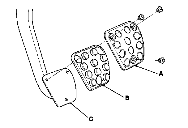 3. Remove the brake pedal plate (A) and the brake pedal cover (B) from the brake pedal pad (C).