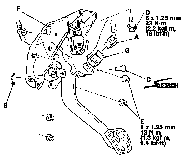 3. Remove the brake pedal bracket mounting bolt (D) and nuts (E).