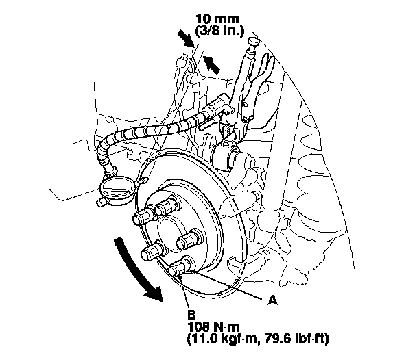 5. Install suitable flat washers (A) and wheel nuts (B), and tighten the wheel nuts to the specified torque to hold the brake disc securely against the hub.