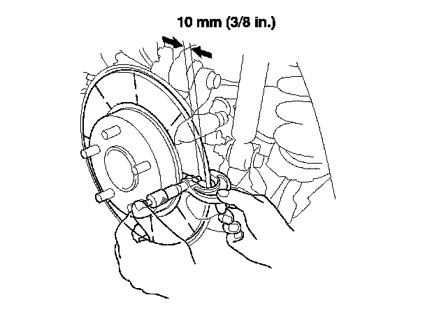 6. Set up the dial gauge against the brake disc as shown, and measure the runout at 10 mm (3/8 in.) from the outer edge of the brake disc.