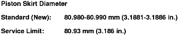 7. Calculate the difference between the cylinder bore diameter and the piston diameter. If the clearance is near, or exceeds the service limit, inspect the piston and engine block for excessive wear.