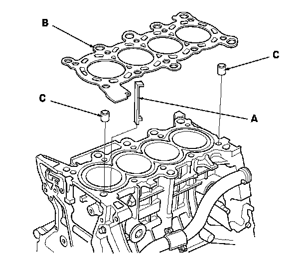 3. Install the new cylinder head gasket (B) and the dowel pins (C) on the engine block. Always use a new cylinder head gasket.