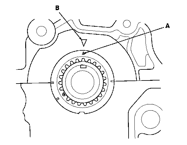 4. Set the crankshaft to top dead center (TDC). Align the TDC mark (A) on the crankshaft sprocket with the pointer (B) on the engine block.