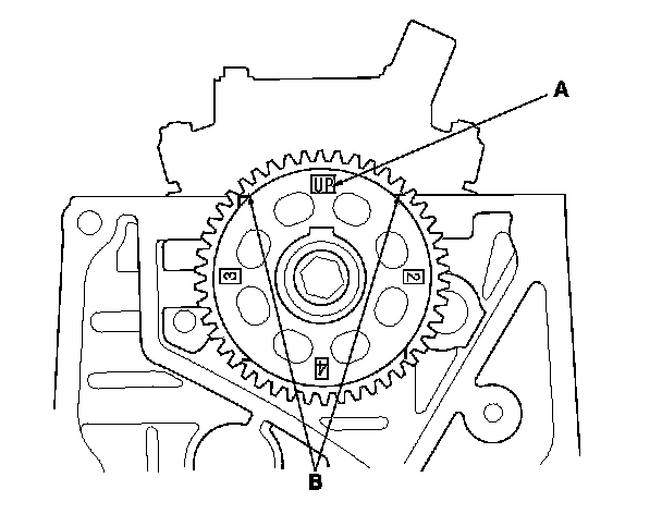 5. Set the camshaft to TDC. The "UP" mark (A) on the camshaft sprocket should be at the top, and the TDC grooves (B) on the camshaft sprocket should line up with the top edge of the head.