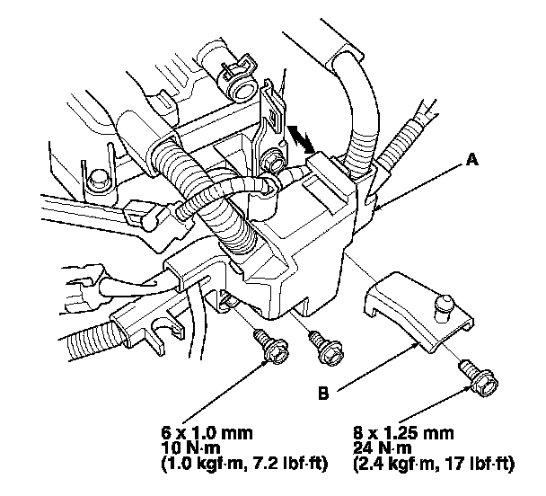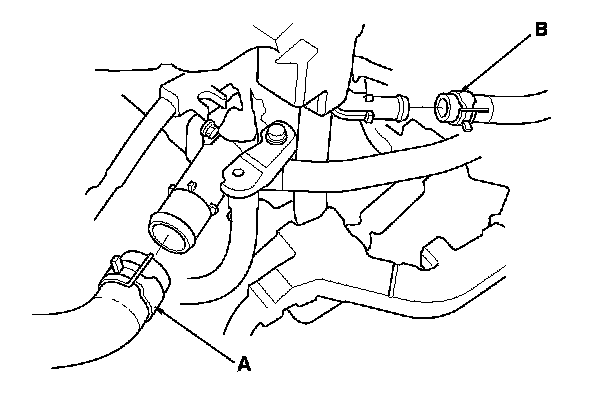 18. M/T model: Connect the upper radiator hose (A) and the heater hose (B).