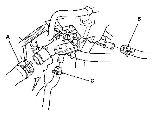 19. A/T model: Connect the upper radiator hose (A), the heater hose (B), and the water bypass hose (C).