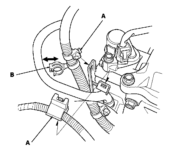21. Install the harness clamps (A), and connect the positive crankcase ventilation (PCV) hose to the clamp (B).