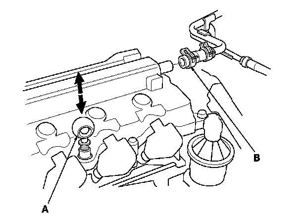 6. Install the dipstick (A), and connect the breather hose (B).