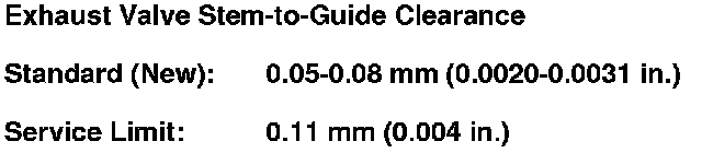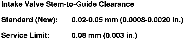 3. Subtract the O.D. of the valve stem, measured with a micrometer, from the I.D. of the valve guide measured with an inside micrometer or ball gauge. Take the measurements in three places along the valve stem and three places inside the valve guide. The difference between the largest guide measurement and the smallest stem measurement should not exceed the service limit.