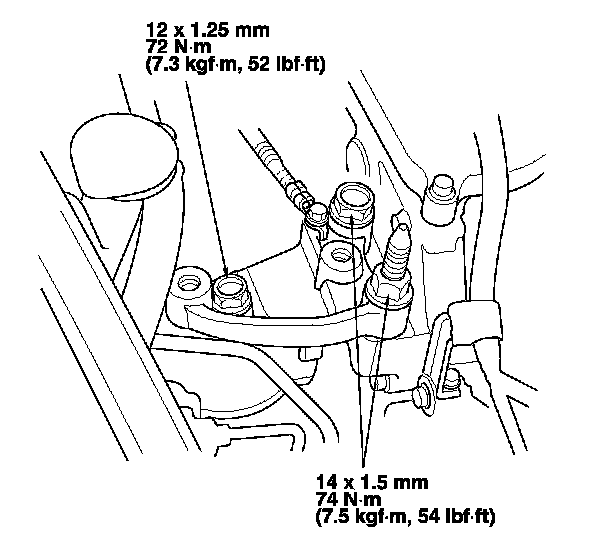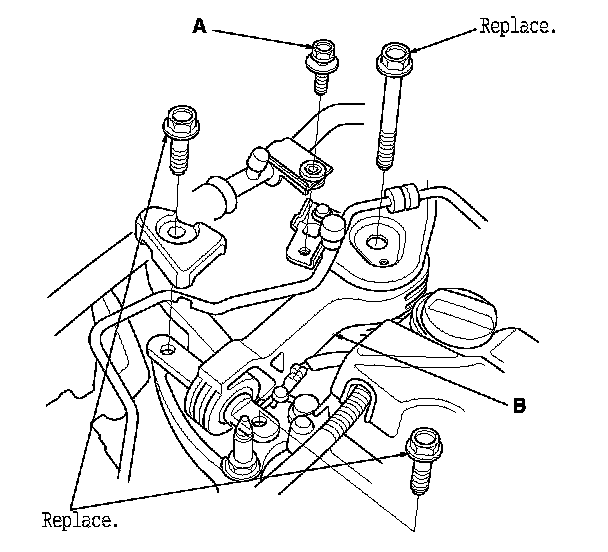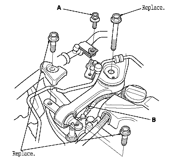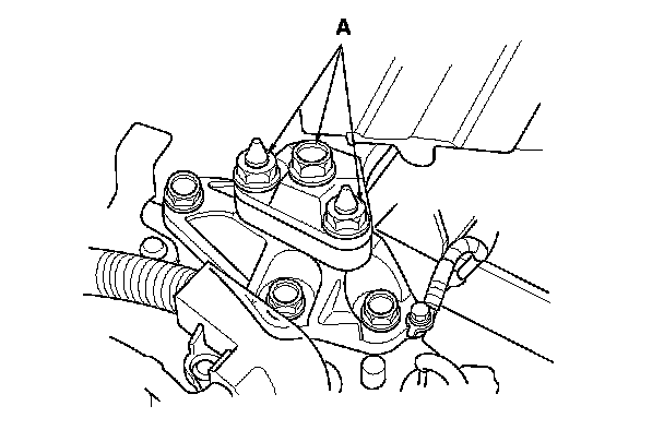 2. Remove the bolt (A) securing the A/C line, then remove the upper torque rod (B).
