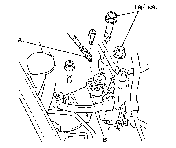 3. Remove the ground cable (A), then remove the side engine mount bracket (B).