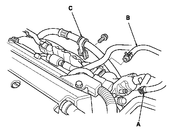 9. Disconnect the evaporative emission (EVAP) canister hose (A) and the brake booster vacuum hose (B), and remove the power steering (P/S) hose clamp (C).