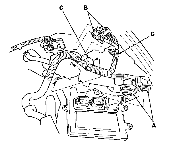 13. Disconnect the ECM/PCM connectors (A) and the engine wire harness connectors (B).