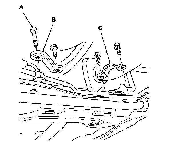 37. EPS model: Remove the steering gearbox mounting bolt (A), the stiffener mounting bolt (B), and the stiffener (C).