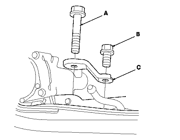58. Attach a chain hoist (A) to the universal lifting eyelet (B) and the transmission hook (C), then lift the engine/transmission until it is securely supported by the chain hoist, and remove the engine support hanger.