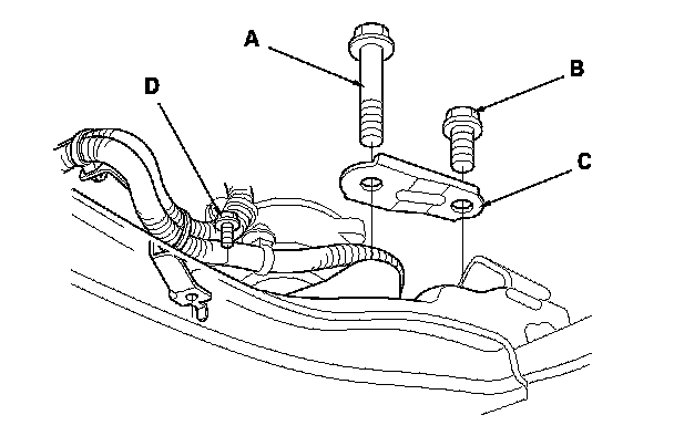 38. EPS model: Remove the steering gearbox mounting bolt (A), the stiffener mounting bolt (B), the stiffener (C), and the bolt (D) securing the harness clamp bracket.