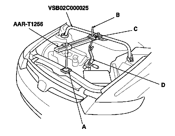 48. Install the front leg assembly (A), the hook (B), and the wing nut (C) to an A and Reds engine support hanger (AAR-T1256) onto the 2006 civic engine hanger (VSB02C000025). Carefully position the engine hanger on the vehicle, and attach the hook to the slotted hole in the support eyelet (D). Tighten the wing nut by hand to lift and support the engine/transmission.
