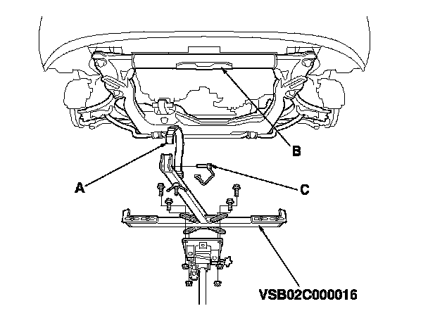 53. Attach the front subframe adapter (VSB02C000016) to the front subframe and hang the belt (A) of the front subframe adapter over the front of the subframe (B), then secure the belt with its stop (C).