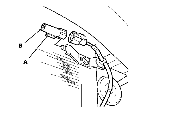 2. Lift the tab (A) to release the lock, then remove the outside air temperature sensor (B) from the receiver/dryer desiccant bracket [from the A/C condenser].