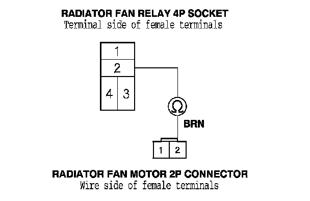 8. Check for continuity between radiator fan relay 4P socket terminal No. 2 and radiator fan motor 2P connector terminal No. 2.