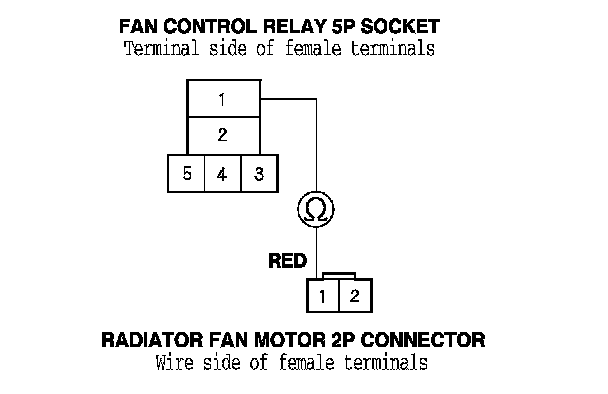 9. Check for continuity between fan control relay 5P socket terminal No. 1 and radiator fan motor 2P connector terminal No. 1.