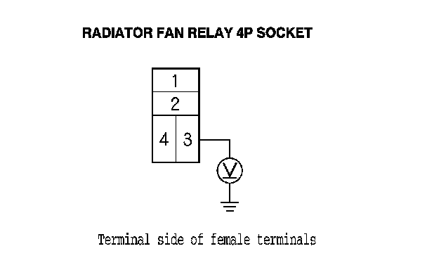 11. Measure the voltage between radiator fan relay 4P socket terminal No. 3 and body ground.