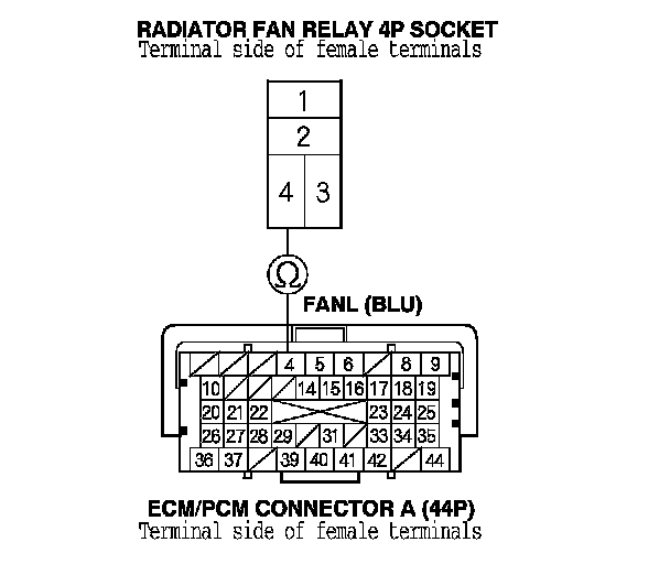 18. Check for continuity between radiator fan relay 4P socket terminal No. 4 and ECM/PCM connector terminal A4.