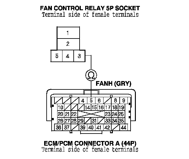 22. Check for continuity between fan control relay 5P socket terminal No. 3 and ECM/PCM connector terminal A5.