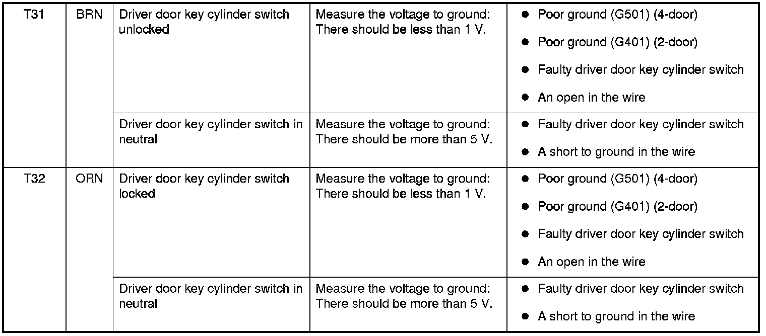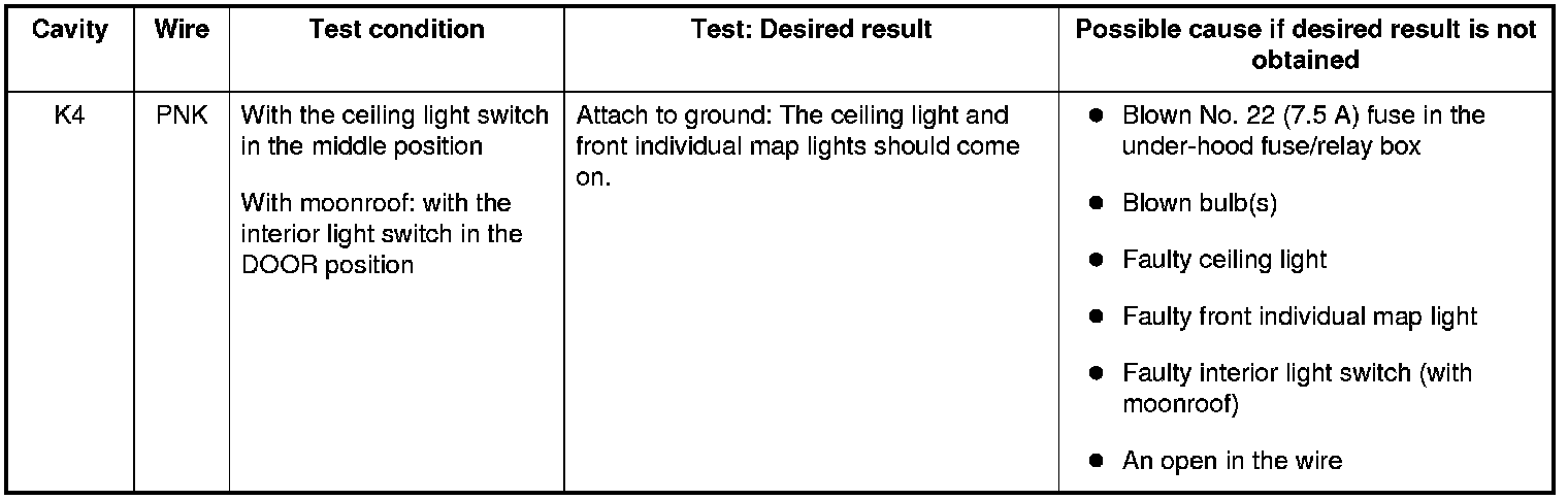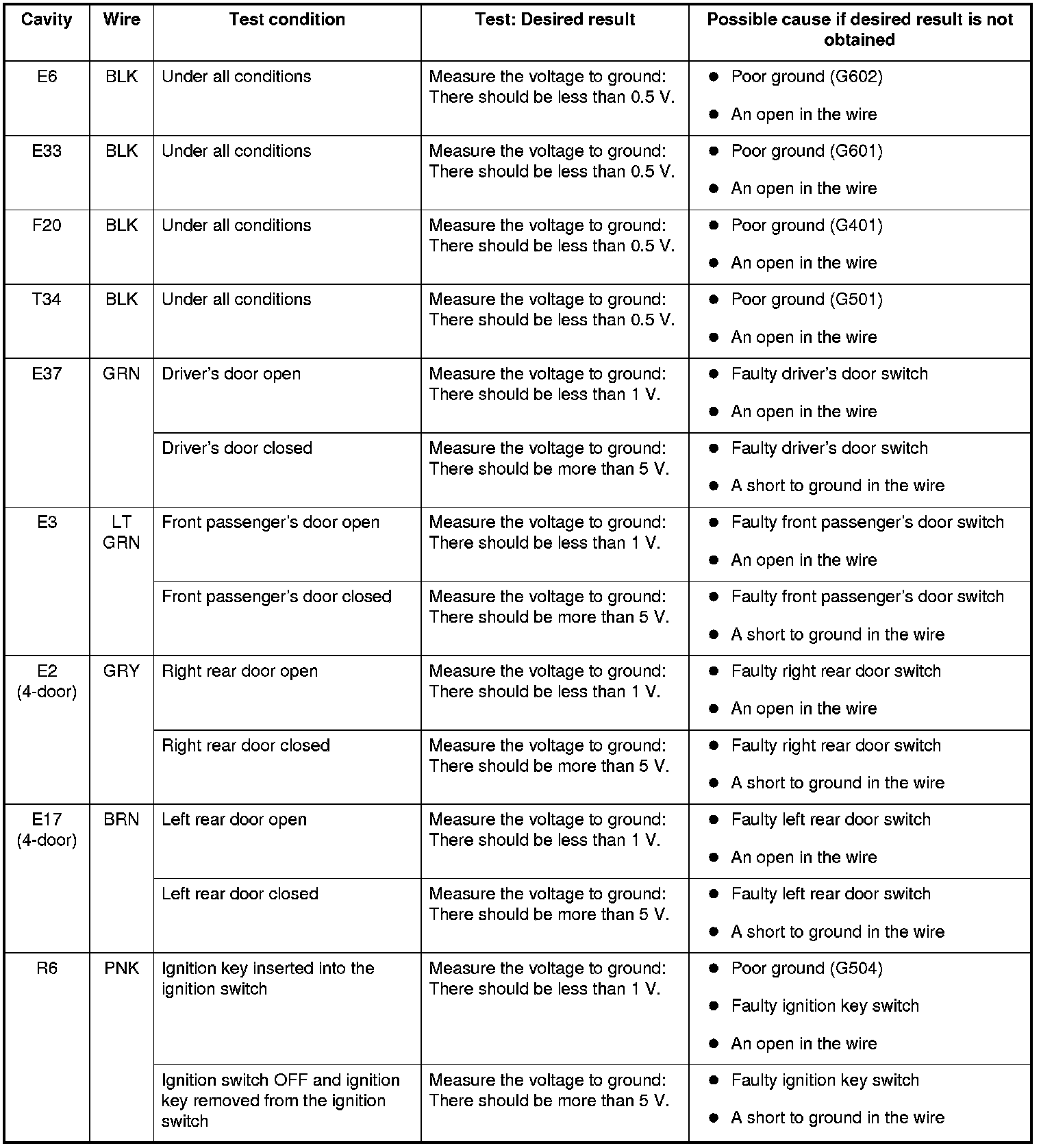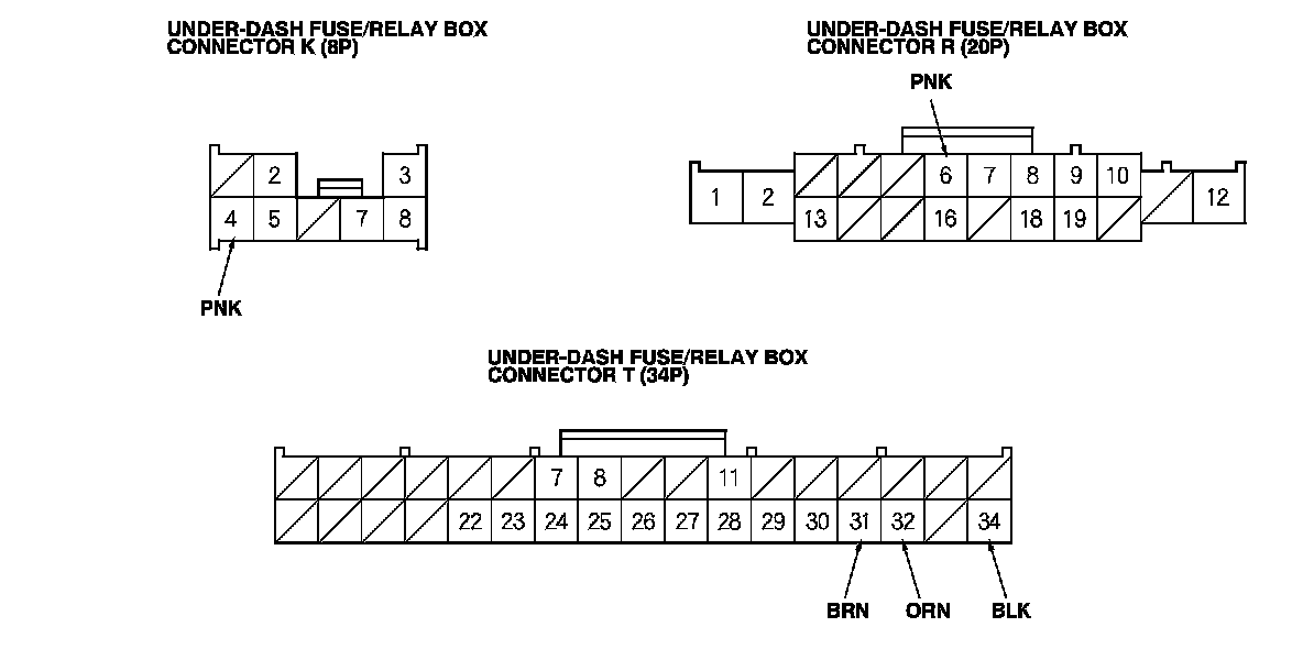 6. Reconnect the connectors to the under-dash fuse/relay box, and do these input tests at the following connectors.