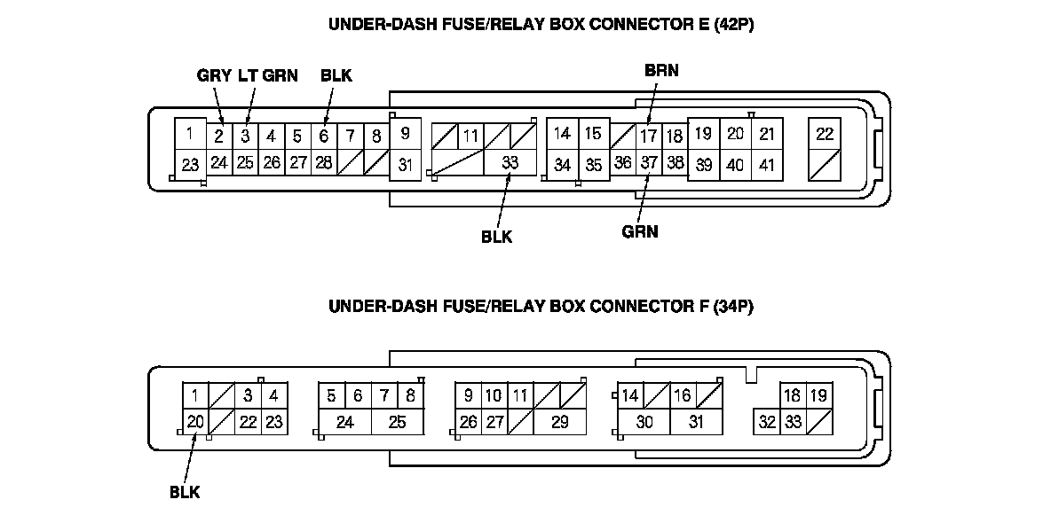 3. Disconnect under-dash fuse/relay box connectors E, F, G, K, Q, and T.