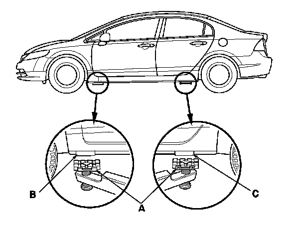 1. Position the lift blocks (A) under the vehicle's front support points (B) and rear support points (C).