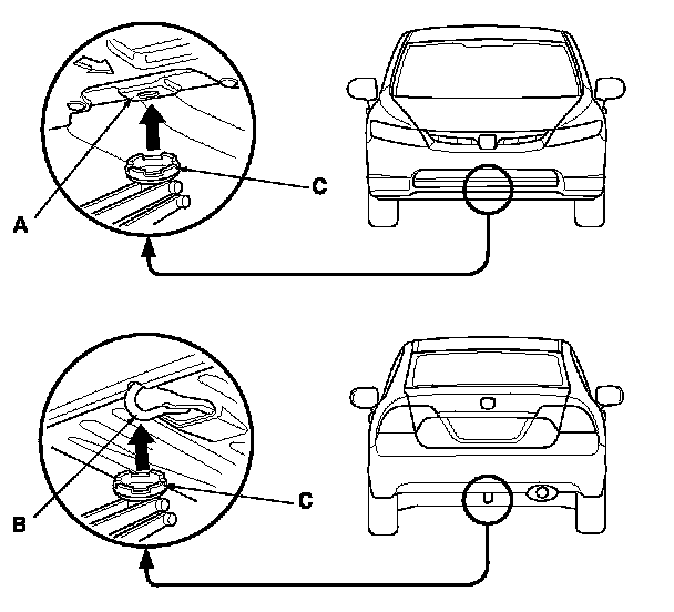 3. Position the floor jack under the front jacking bracket (A) or the rear jacking bracket (B). Center the jacking bracket on the jack lift platform (C), and jack up the vehicle high enough to fit the safety stands under it.