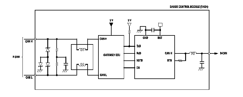The body controller area network (B-CAN) and the fast controller area network (F-CAN) share information between multiple electronic control units (ECUs). B-CAN communication moves at a slower speed (33.33 kbps) for convenience related items and for other functions. F-CAN information moves at a faster speed (500 kbps) for "real time" functions such as fuel and emissions data. To allow both systems to share information, the gauge control module translates information from B-CAN to F-CAN and from F-CAN to B-CAN.