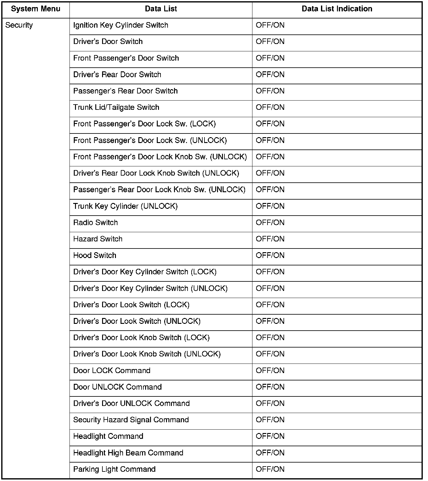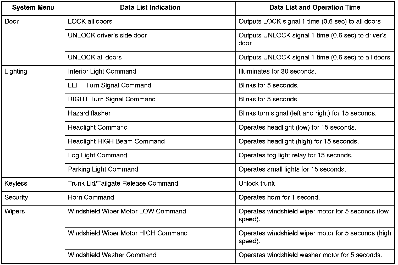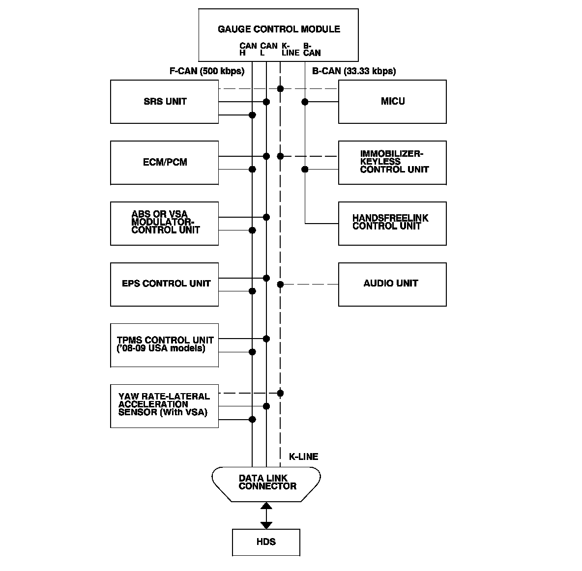By connecting the HDS to the data link connector (DLC), the HDS can retrieve the diagnostic results from the MICU via a diagnostic line called K-LINE. The K-LINE is distinguished from the CAN line, and connected to the CAN related ECUs. The MICU is a gateway between the HDS and B-CAN related ECUs, and sends B-CAN diagnostic results to the HDS. When doing a function test with the HDS, the HDS sends an output signal through the K-LINE to the MICU. The MICU either relays the request to another ECU, or commands the function its self.