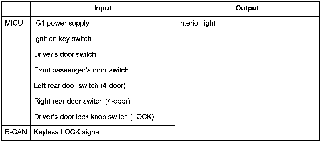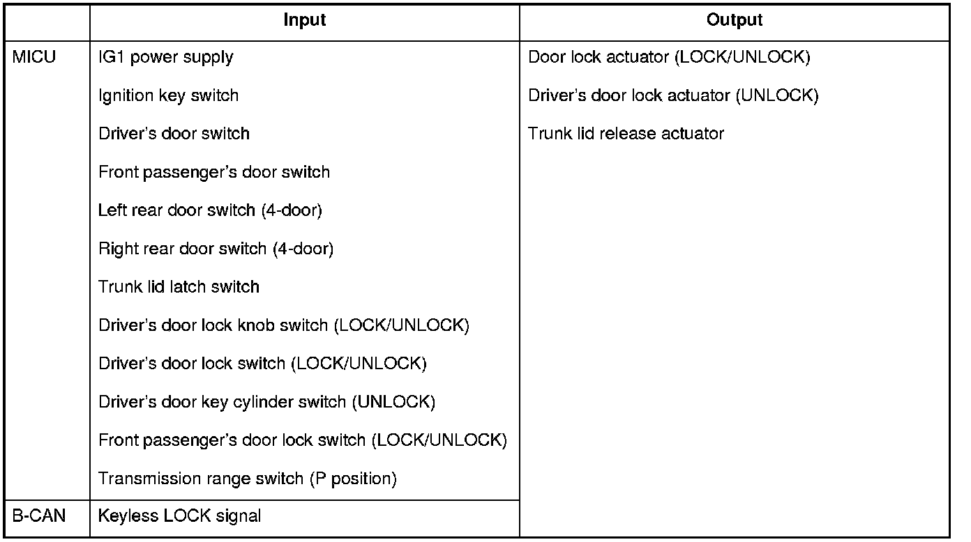 The MICU controls the door lock actuators based upon B-CAN signals and input signals from each switch.