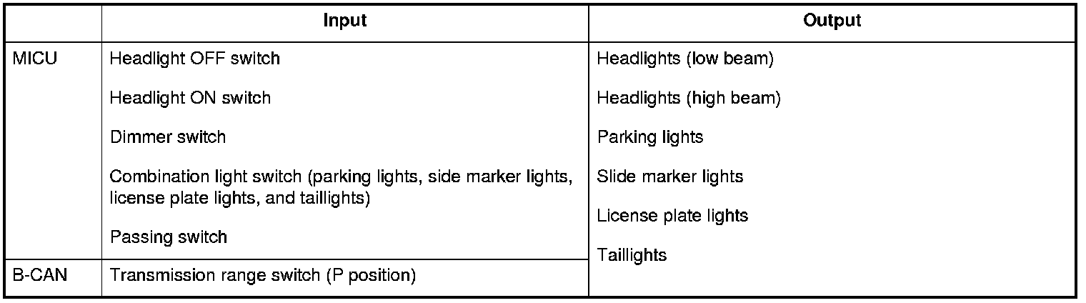 The MICU contains the relay circuits of the headlight high/low beam and taillights, and controls the lighting system ON/OFF based upon input signals from the combination light switch.