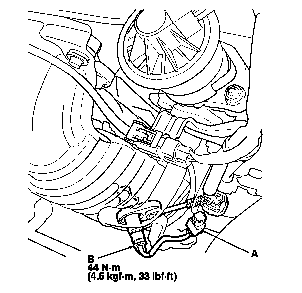 1. Disconnect the secondary HO2S 4P connector (A), then remove the secondary HO2S (B).