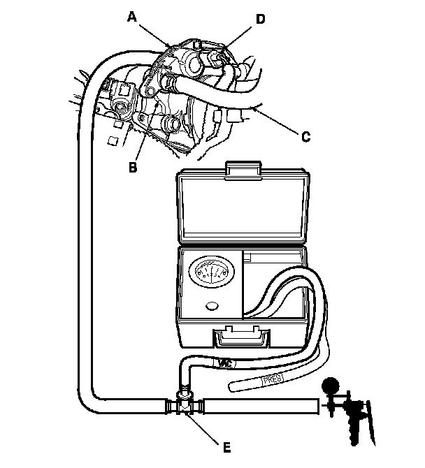 8. Remove the EVAP canister purge valve (A) from the throttle body (B) without disconnecting the vacuum hose (C) and the EVAP canister purge valve 2P connector (D), Service and Repair then connect a T-fitting (E) from the vacuum gauge and the vacuum pump/gauge 0-30 in.Hg to the EVAP canister purge valve as shown.
