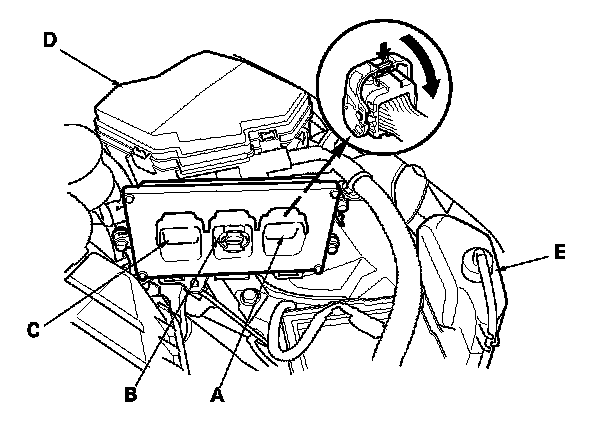 10. Remove the bolts (D), then remove the ECM/PCM (E).
