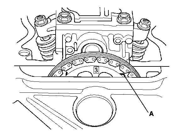 7. Rotate the crankshaft clockwise. Align the No. 3 piston TDC groove (A) on the camshaft sprocket with the top edge of the head.