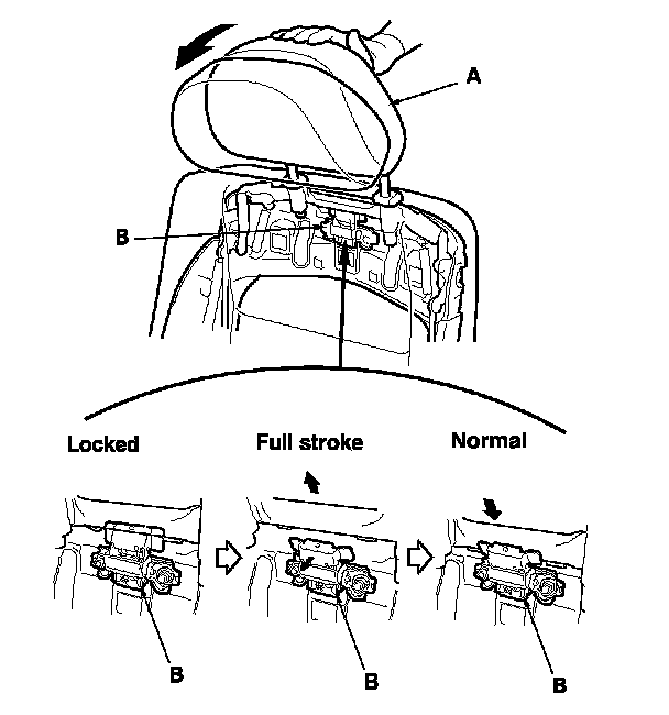 1. Push the head restraint (A) forward fully from the locked position to release the inertial lock (B).