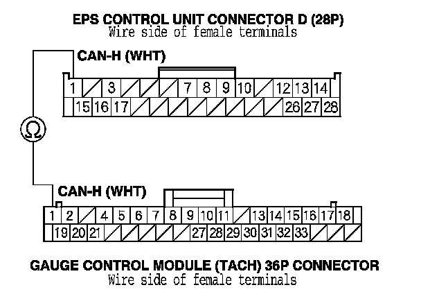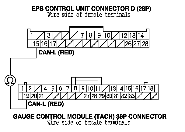 15. Check for continuity between EPS control unit connector D (28P) terminal No. 15 and gauge control module (tach) 36P connector terminal No. 19.