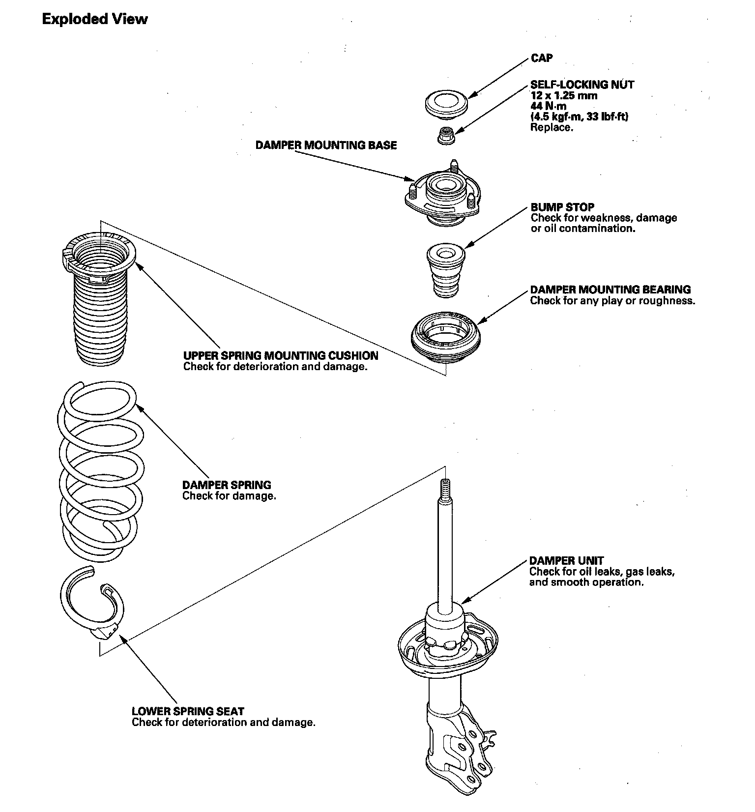 3. Release the pressure from the strut spring compressor, then disassemble the damper as shown in the Exploded View.