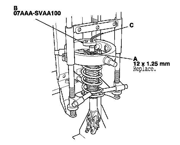 2. Compress the damper spring, then remove the self-locking nut (A) using the strut nut adapter (B) while holding the damper shaft with a hex wrench (C). Do not compress the spring more than necessary to remove the nut.