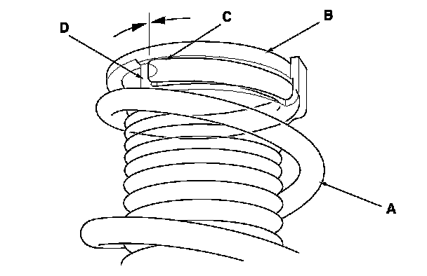 1. Install the damper spring (A) on the upper spring mounting cushion (B) by aligning the upper end (C) of the damper spring with the ledge portion (D) of the upper spring mounting cushion.