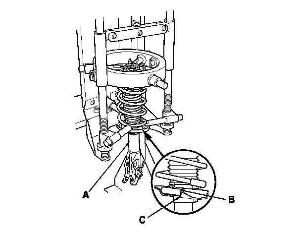 NOTE: When compressing the damper spring, use a commercially available strut spring compressor (Branick MST-580A or Model 7200, or equivalent) according to the manufacturer's instructions.