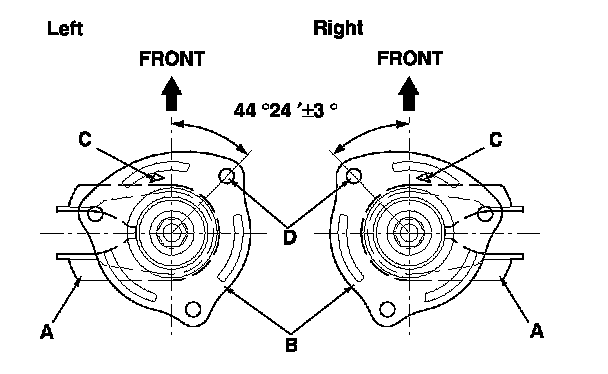 6. Align the angle of the strut bolt (D) on the damper bracket as shown.