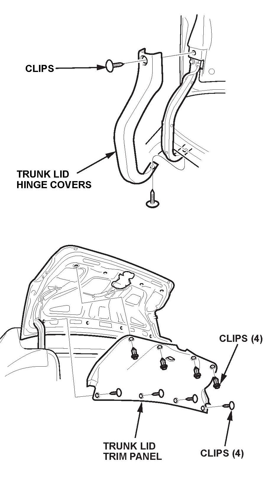 6. On some models, install the trunk lid trim and the trunk lid hinge covers.